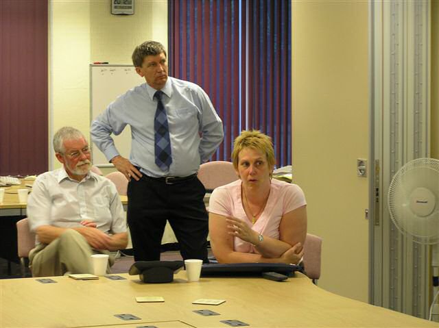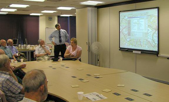 Ian pointed out that Helen was the expert in this field and we enjoyed a demonstration of her skills, particularly the way in which she effortlessly put the interactive board through its paces. On the large board (see photo) it is possible to overlay a map of Derbyshire with whatever features are required and to zoom in on to individual streets and houses (although we were assured that it was not being used to look for possible council tax revaluations ! ). For example, in the event of flood warnings, areas at risk can be highlighted so that preventative measures can be directed correctly and efficiently. If a gas or chemical incident requires say a 200 metre exclusion zone, this can be added to the map and then a list of all the affected properties displayed. If emergency centres are required, these can be displayed alongside their capacities etc. Chemical pollution plumes can also be added - no more chinagraph pencils on to transparent plastic maps.