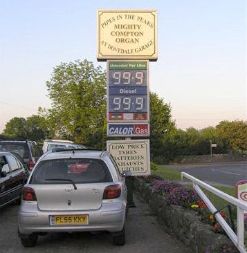 If you travel on the road from Ashbourne towards Buxton, after about two miles you'll see a left turn to Thorpe. As you enter the village, you'll see a garage with a rather unusual sign. In addition to advertising its fuel prices, it mentions a Compton organ. You have reached "Pipes in the Peaks" at Dovedale Garage.