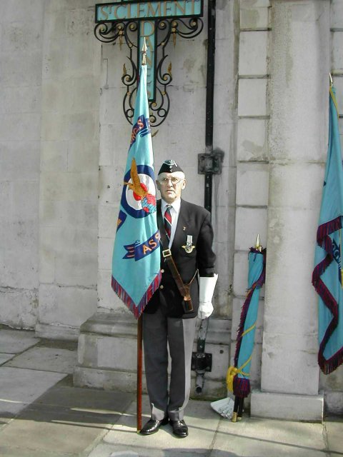 One of the 60 RAFA standards on parade was that of the Maidstone branch, carried by Robin Green, the branch Chairman, and a former member of No 1 Group ROC. Robin, who has been the branch Standard bearer for 10 years, is seen at the West Door of St Clement Danes with his Standard, and wearing the ROC Medal.