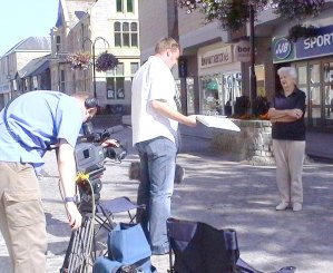 Photo above shows Andrew Denyer videoing an interview with former wartime Truro Ops Room W/Obs Eileen Brush in the centre of Truro again in july 2003. Behind Eileen is the former Marks and Spencer building which was the site of the wartime ROC Ops Room. Just out of picture is the commemorative plaque to the members of the ROC in Cornwall now mounted on the wall of the Portman Building Society.