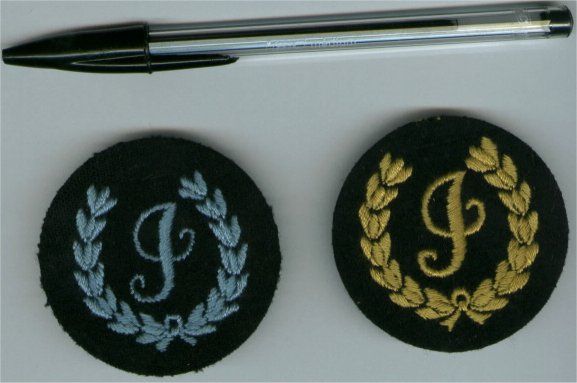 They are round cloth badges approximately two and a half inches across, black with a laurel wreath and what looks like a "J" in the centre. One is in blue the other yellow/gold??