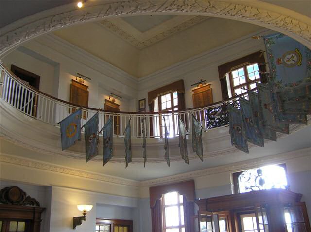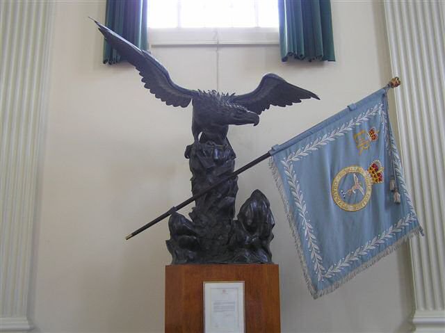 In the Dining Room, Cranwell’s Queen’s Colour is on permanent display but there is another Queen’s Colour in the Rotunda. The display here consists mainly of the Standards of Squadrons which have been temporarily disbanded – if a Squadron is subsequently reformed, its Standard is marched out with due ceremony, reconsecrated and returned to the Squadron. However there is also the Queen’s Colour of the Royal Observer Corps, sent from Bentley Priory for safe keeping when the Corps was disbanded. It position at the end gives it very high visibility and, as our guide pointed out, it is unusual in having two crowns – The King’s Crown on the badge and the Queen’s Crown in the top left hand corner. But don’t get your hopes up – the “temporarily disbanded” is unlikely to apply to it.