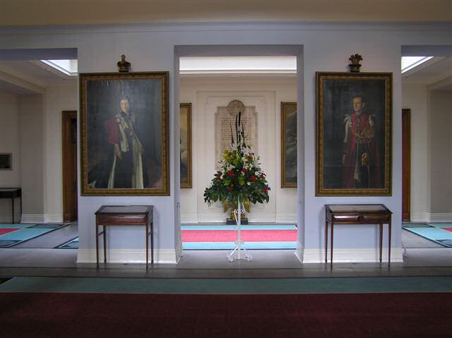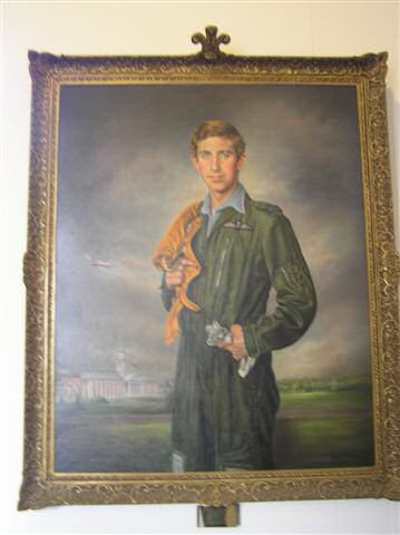The photograph below shows the main building and a close up of the dome together with photographs of the foundation stone. In the dome is a light which is registered with Trinity House and in the early days could be seen at over thirty miles, the most inland registered lighthouse. The modern light is not so powerful. In the Entrance Hall are portraits of the Queen and the Duke of Edinburgh by Norman Hepple. Another Royal portrait in one of the corridors shows Prince Charles when he received his pilot’s training at Cranwell in 1971. At the time, the IRA was becoming active in the UK and so tighter security rules were introduced, including one that meant cars were parked well away from buildings. It was, however, decided, that this might be counter-productive to HRH’s security and so a patch was gravelled between two blocks for his Aston Martin. Careful examination of the portrait (unfortunately not very clear on the photograph below) shows a blue object in the bottom left-hand corner. It is said that when Prince Charles saw the picture, he asked for the car to be painted out but the artist (Mara McGregor) said that either the painting went up as it was or not at all. On visits to Cranwell, it is rumoured that he still says “See that you haven’t yet moved the car !”