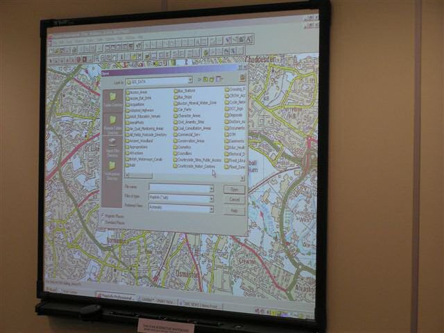 Ian pointed out that Helen was the expert in this field and we enjoyed a demonstration of her skills, particularly the way in which she effortlessly put the interactive board through its paces. On the large board (see photo) it is possible to overlay a map of Derbyshire with whatever features are required and to zoom in on to individual streets and houses (although we were assured that it was not being used to look for possible council tax revaluations ! ). For example, in the event of flood warnings, areas at risk can be highlighted so that preventative measures can be directed correctly and efficiently. If a gas or chemical incident requires say a 200 metre exclusion zone, this can be added to the map and then a list of all the affected properties displayed. If emergency centres are required, these can be displayed alongside their capacities etc. Chemical pollution plumes can also be added - no more chinagraph pencils on to transparent plastic maps.