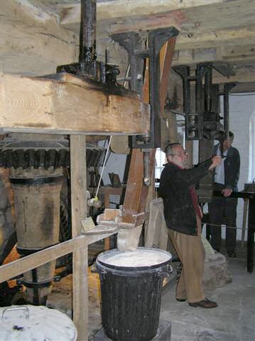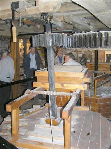 On the next floor, there are two sets of stones although in the past there were three. These can be operated independently by engaging their drive gears and their spacings can also be adjusted individually. This enables different grains to be processed at the same time and different grades of flour to be produced.