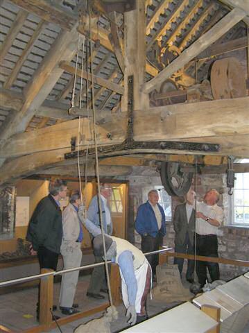 The top floor contains the hoist mechanism (no longer operating) for raising the sacks of grain for feeding under gravity to the millstones on the floor below.