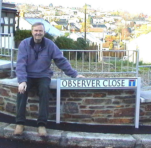 Lawrence Holmes, Chairman of the Truro Branch ROCA at the side of the new access road sign at the site of the former No 11 Group HQ in Truro, Cornwall. The Group Control was demolished in 2002 and 19 new houses were built on the site. Some of the houses can be seen in the background. The Truro Branch persuaded the Local Authority to name the access road 'Observer Close' to reflect the ROC occupation of the site from 1963 to 1995