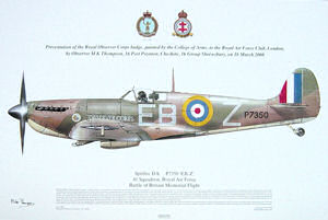 Thirdly, I have a special surprise item that you do not know about. This is a special version of the ROC Squadron Print. It states at the top "Presentation of the Royal Observer Corps badge, painted by the College of Arms, to the Royal Air Force Club, London; by Observer M K Thompson, 16 Post Poynton, Cheshire, 16 Group Shrewsbury". During the Second World War the Commandant of the ROC asked for £5,000 to purchase a Spitfire for the RAF. A large sum of money today, a massive sum then. The ROC raised nearly double this amount and the aircraft depicted is the Spitfire that was purchased with "Observer Corps" on the side and the ROC badge. It achieved three kills. This is a very rare print as the usual minimum number of prints is 200, but I have special contacts and they kindly produced just 20 copies."