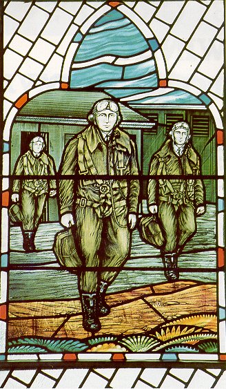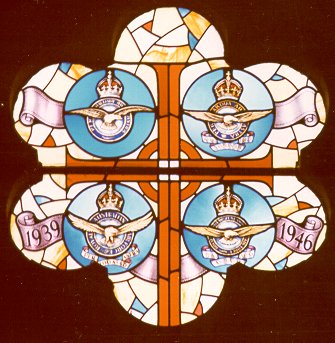 Several designs for the Memorial Window were submitted for consideration by the committee, but the final choice was of two wartime scenes of Long Kesh. The Rose Window above was to incorporate the wartime emblems of the RAF, RCAF, RNZAF and RAAF and great care was needed to get the emblems correct in every way. Squadron Leader Peter Singleton of the RAF Air Historical Branch and the Commonwealth Wargraves Commission provided invaluable details.
