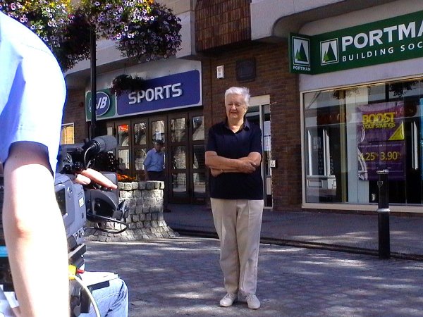 Photo above shows Andrew Denyer videoing an interview with former wartime Truro Ops Room W/Obs Eileen Brush in the centre of Truro again in july 2003. Behind Eileen is the former Marks and Spencer building which was the site of the wartime ROC Ops Room. Just out of picture is the commemorative plaque to the members of the ROC in Cornwall now mounted on the wall of the Portman Building Society.