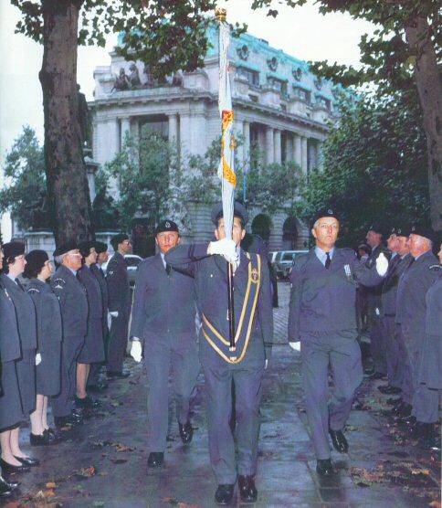 After a ceremonial fanfare by a party of trumpeters from the Central Band of the Royal Air Force the Banner was marched in slow time through the congregation to the altar steps. The last officer to salute the passing of the Banner was Observer Lieutenant Commander G I Hartley. In handing over the Sovereign's Banner the Commandant ROC, Air Commodore G M Boddy OBE RAF, said "Reverend Sir, I ask you to receive this Banner of the Royal Observer Corps for safe keeping in the House of God.“ Once prepared for hanging (in January 1992) our Banner will be displayed in perpetuity at St Clement Danes, along with many other Banners, Colours, Standards and Ensigns of the Royal Air Force. There it will be seen by the many welcome visitors to the Church, which is open daily throughout the year.