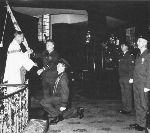 The Banner's entrance into church was heralded by the pealing of the famous bells of St Clement's and the route was lined by 20 observers from No 2 Group (Horsham). The Corps' links with its sister organisation in Denmark, the Danish Ground Observer Corps (Luftmeldekorpset or LMK) and St Clement's links with Denmark were marked by the presence at the service of Major Thirkeldsen.